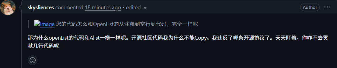 就在 OpenList 逐步建立口碑,获得 13.1k Star 与超 200 位贡献者之时,Alist 团队的 PR #9217 将事态推向高潮:@skysliences 提交的代码直接照搬 OpenList 部分模块,完全未标注来源或版权信息。