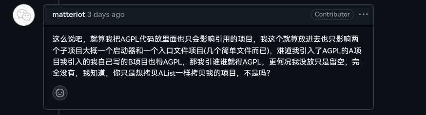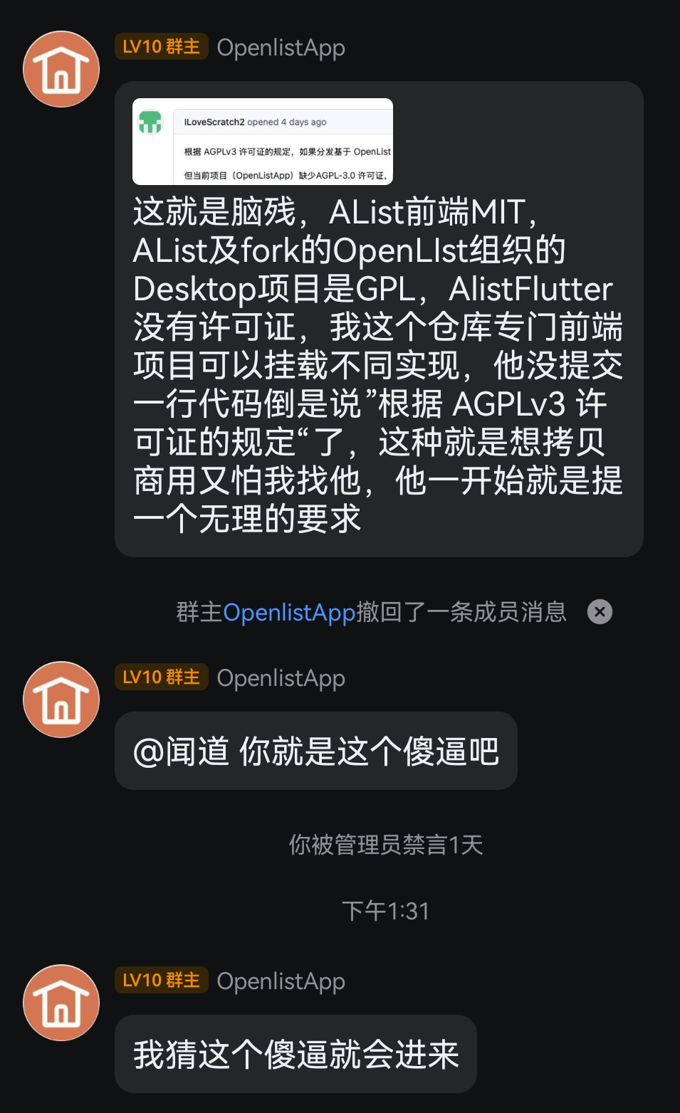 但 OpenListApp 没有这么做。它一开始甚至连许可证都没加上,后面被追问得太多,才仓促加上 MIT,且未对嵌入的 AGPL 库做任何声明。