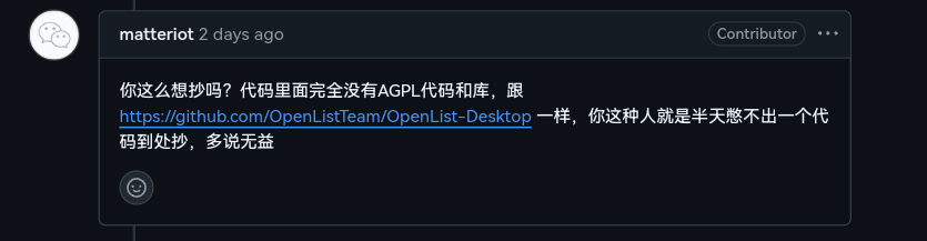 他的回应是:“你就是想抄我的项目”“你这种人就是憋不出代码到处抄”……甚至说我“不配提AGPL”。是的,我提出的是一份对AGPL合规的疑问,他的回应却是上纲上线地羞辱、否定、扭曲动机。